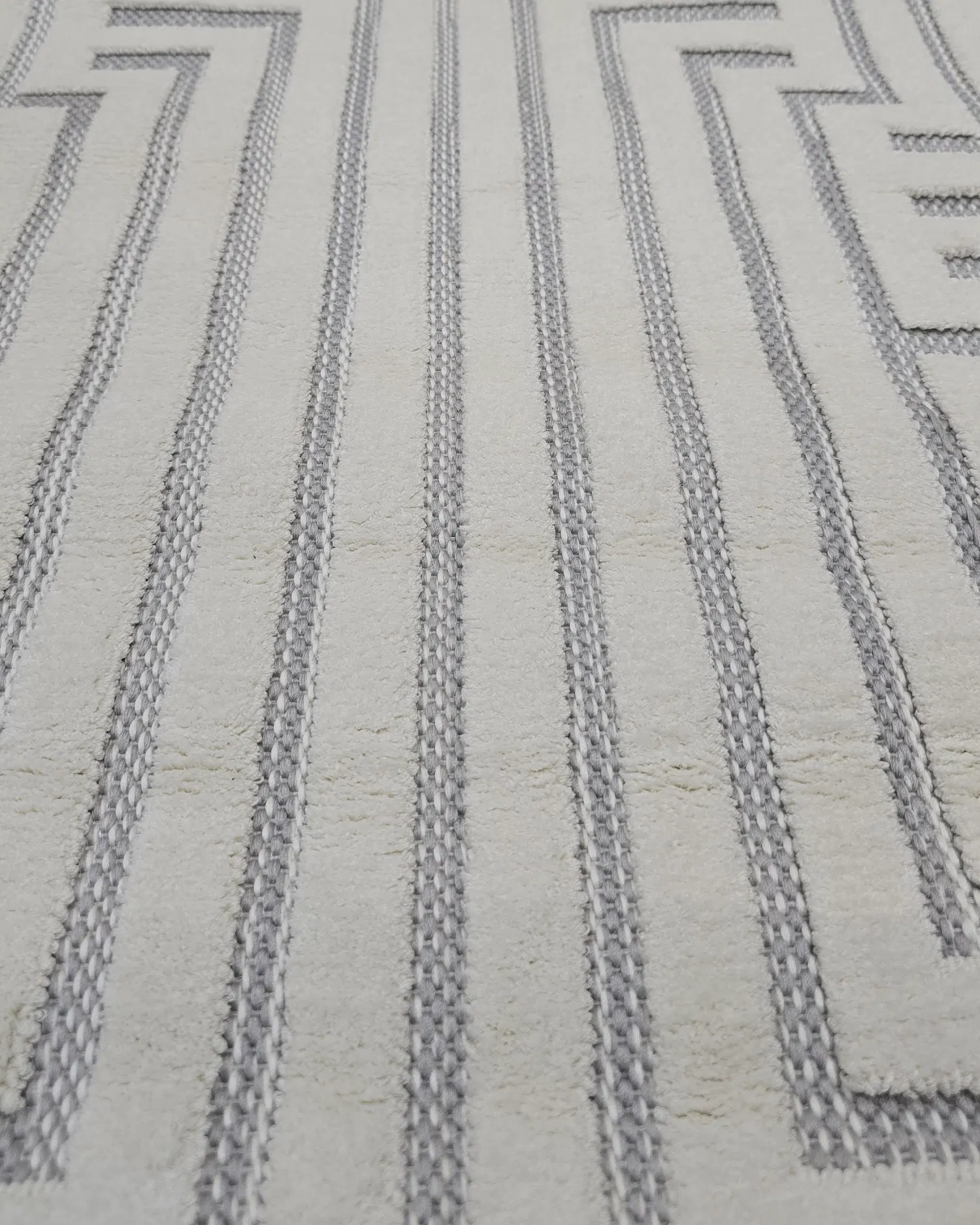 Eleva tu ambiente con una alfombra que mezcla líneas arquitectónicas y un diseño geométrico en perfecto equilibrio. Sus tonos blancos y grises aportan claridad, amplitud y un aire contemporáneo que encaja a la perfección en salas, comedores, habitaciones u oficinas con estilo moderno o minimalista.