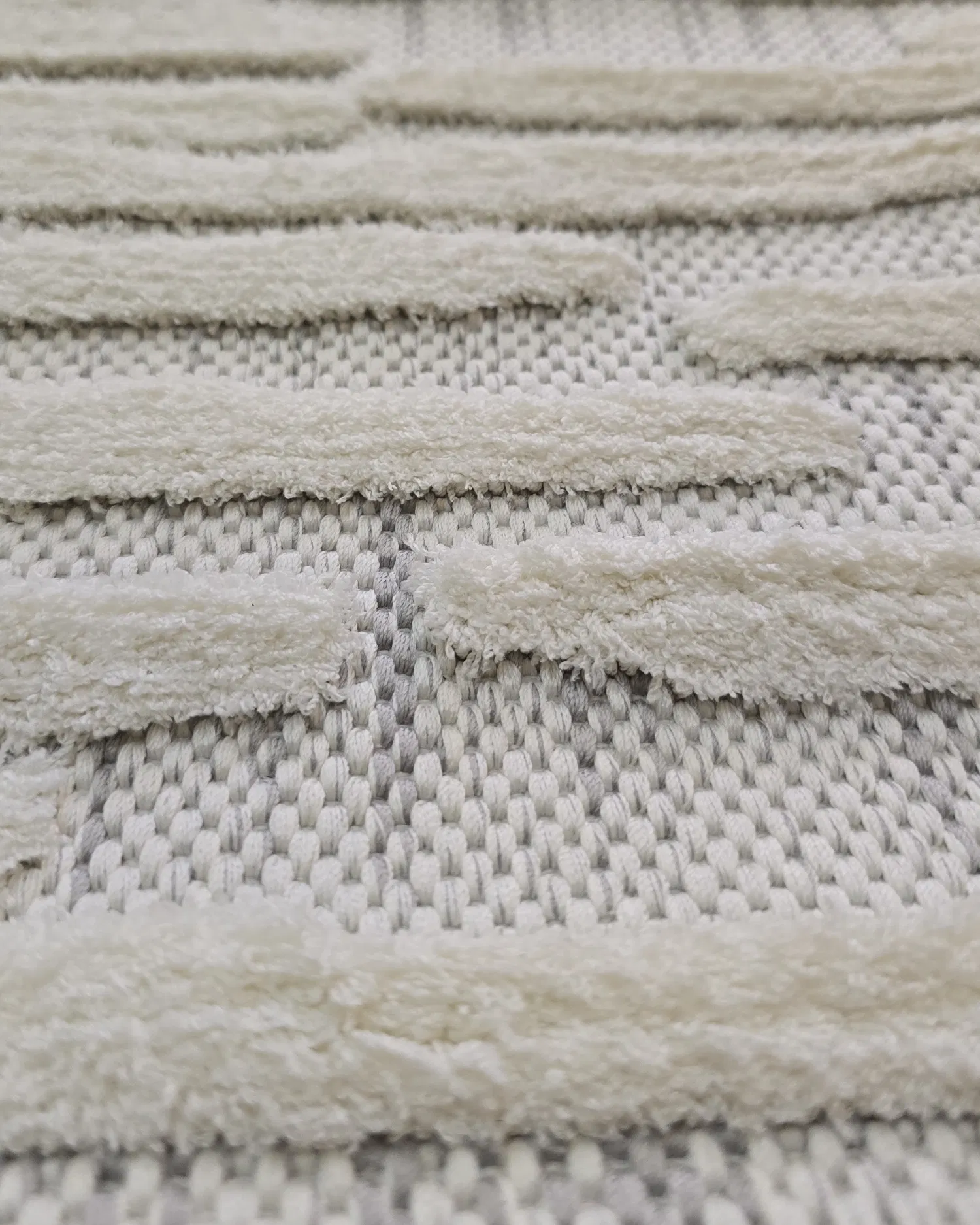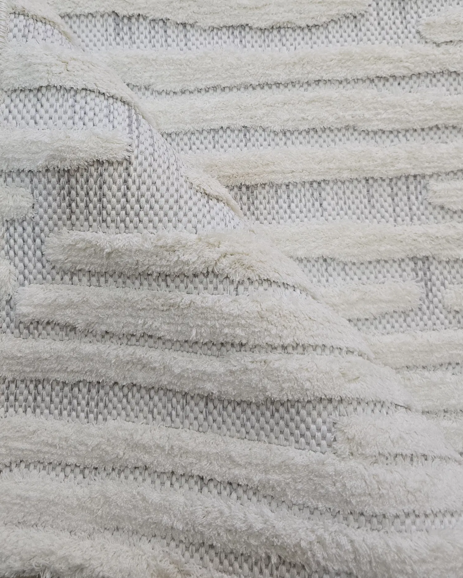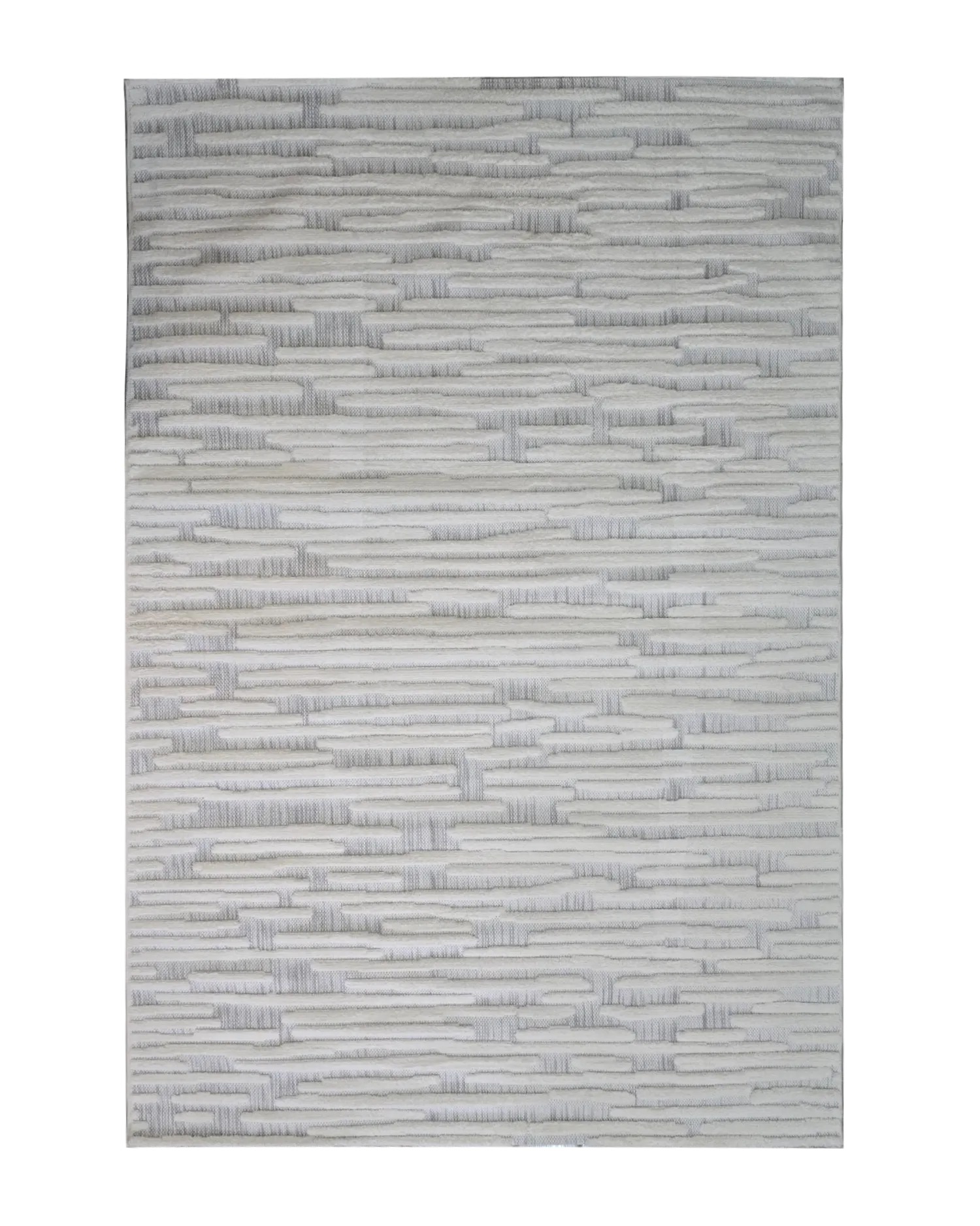 Una alfombra moderna y minimalista con líneas en relieve que crean una textura sutil y tridimensional. Sus tonos blanco y gris aportan serenidad y estilo, perfecta para espacios luminosos y ambientes de inspiración nórdica o contemporánea.
